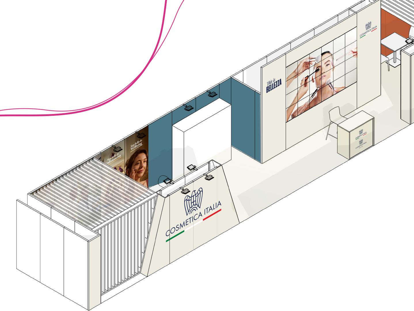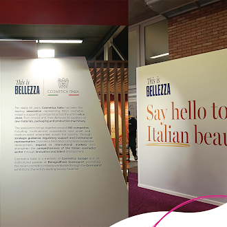 Cosmetica Italia, che da anni partecipa a Cosmoprof Worldwide Bologna in qualità di partner, per l'edizione 2026 aveva una novità importante da comunicare: il lancio della Campagna This Is Bellezza, il progetto che valorizza l’unicità del beauty italiano e crea un’alleanza tra imprese, istituzioni e stakeholder. Quindi per gli allestimenti dei suoi stand aveva bisogno di un supporto grafico per valorizzare le nuove linee guida della comunicazione di Cosmetica Italia.